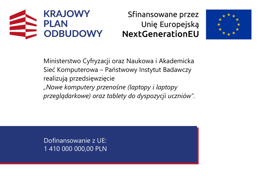 Realizacja inwestycji C2.1.2. Wyrównanie poziomu wyposażenia szkół w przenośne urządzenia multimedialne – inwestycje związane ze spełnieniem minimalnych standardów wyposażenia Krajowego Planu Odbudowy i Zwiększania Odporności (KPO) – wskaźnik C15G Nowe komputery przenośne (laptopy, laptopy przeglądarkowe i tablety) do dyspozycji uczniów.