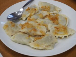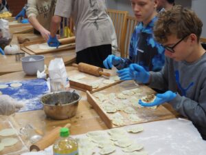 Odbyły się również najbardziej wyczekiwane warsztaty kulinarne, podczas których seniorzy podzielili się z młodzieżą swoją wiedzą i doświadczeniem w lepieniu pierogów. Wspólnie przygotowane zostało ciasto, a potem powstały aż cztery rodzaje pierogów: ruskie, z kapustą i grzybami, ze śliwkami oraz z jabłkami. Pracy było dużo, ale radości jeszcze więcej!