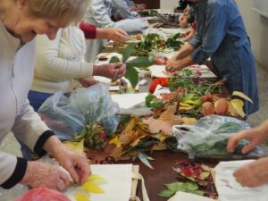 Warsztaty plastyczne seniorzy i uczniowie rozpoczęli od przygotowania materiałów – wcześniej zebrane zostały liście i kwiaty, które posłużyły do wykonania botanicznych nadruków na ekologicznych torbach z tkaniny. Efekty były zachwycające – każda torba stała się unikalnym dziełem sztuki inspirowanym naturą Doliny Baryczy.