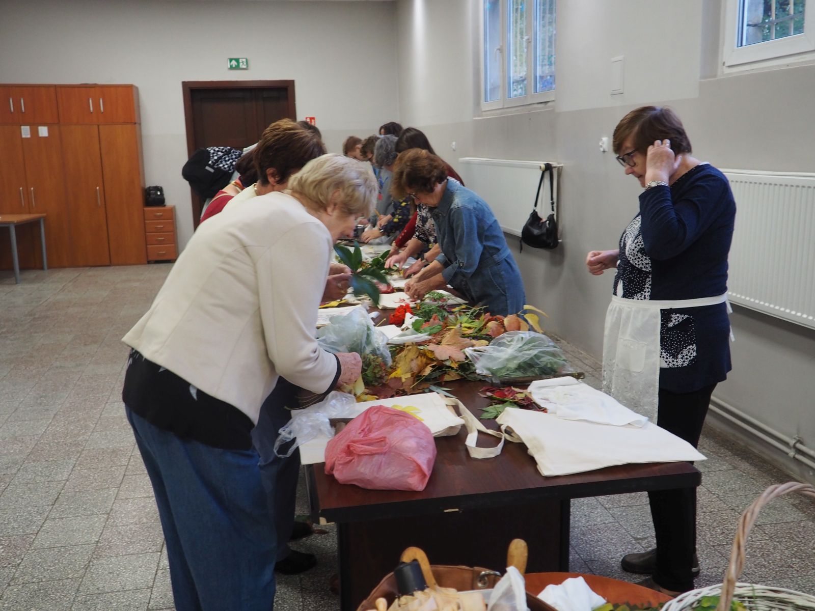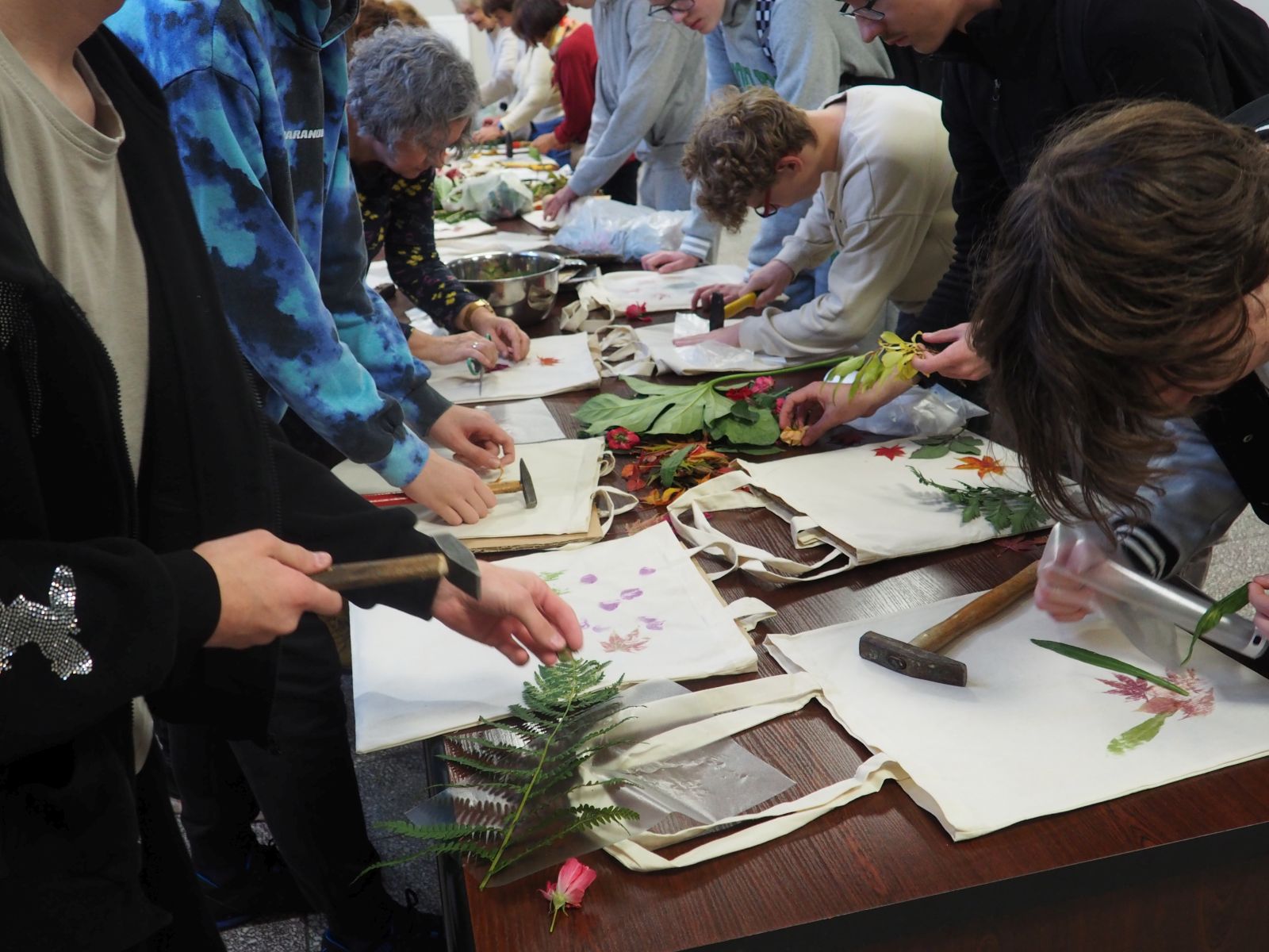Warsztaty plastyczne seniorzy i uczniowie rozpoczęli od przygotowania materiałów – wcześniej zebrane zostały liście i kwiaty, które posłużyły do wykonania botanicznych nadruków na ekologicznych torbach z tkaniny. Efekty były zachwycające – każda torba stała się unikalnym dziełem sztuki inspirowanym naturą Doliny Baryczy.