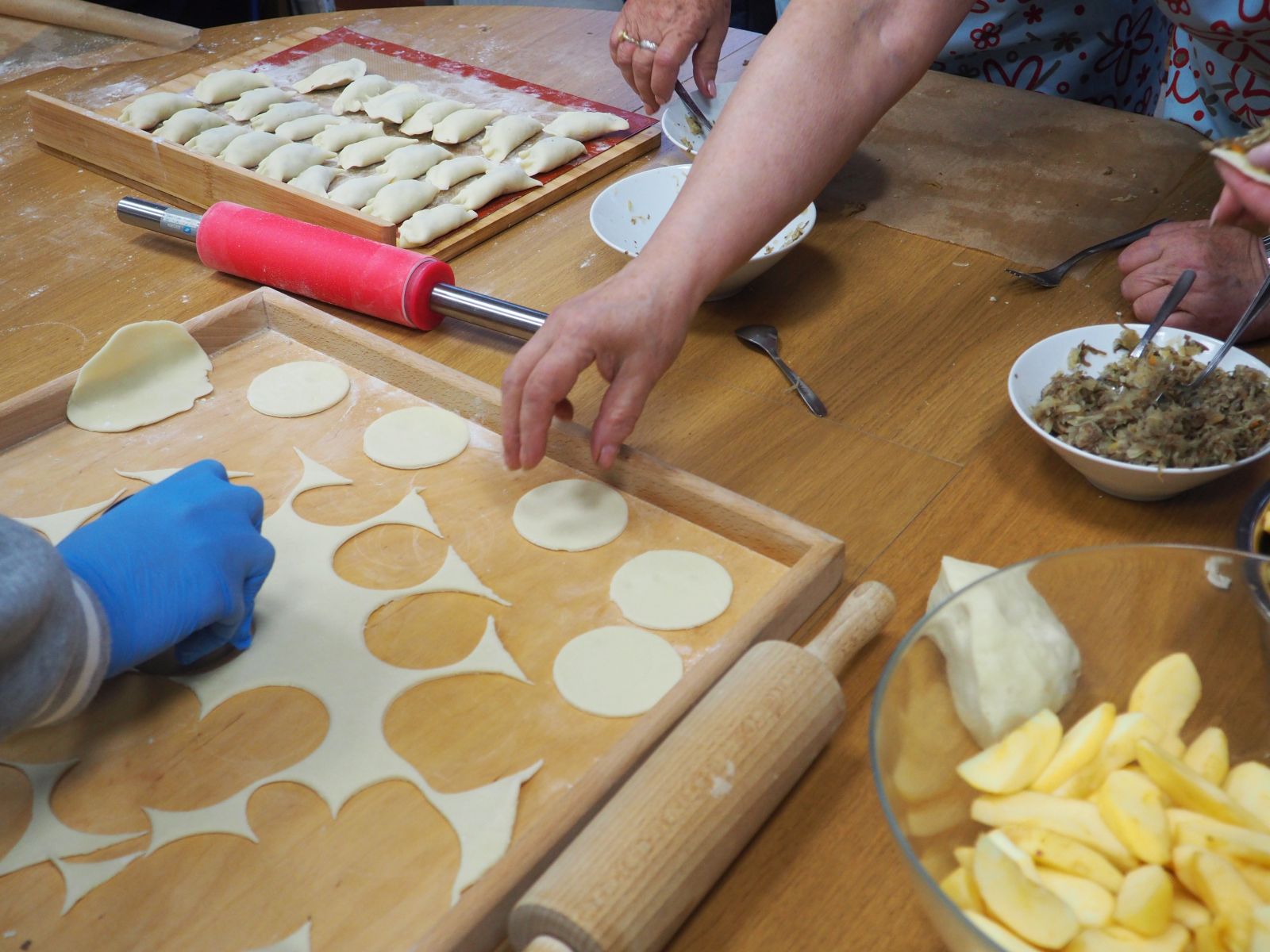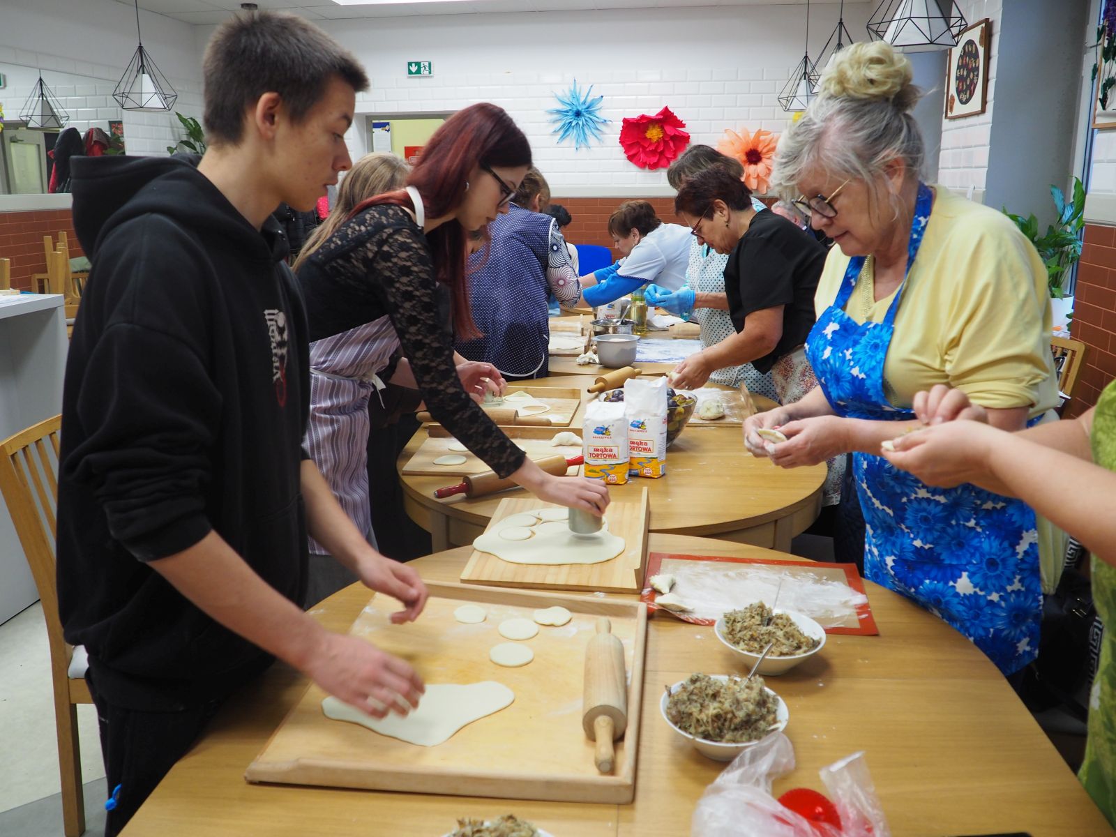 Odbyły się również najbardziej wyczekiwane warsztaty kulinarne, podczas których seniorzy podzielili się z młodzieżą swoją wiedzą i doświadczeniem w lepieniu pierogów. Wspólnie przygotowane zostało ciasto, a potem powstały aż cztery rodzaje pierogów: ruskie, z kapustą i grzybami, ze śliwkami oraz z jabłkami. Pracy było dużo, ale radości jeszcze więcej!